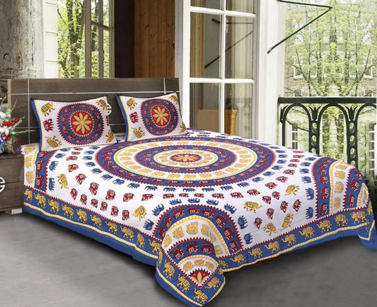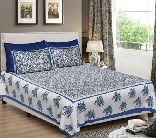 Blue Cotton King Size Standard Elephant Print Jaipuri Bed Sheet With Pillow Cover For Double Bed - JBB18