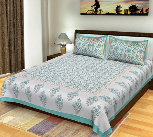 King Size Standard Turquoise Colour Cotton Rajasthani Bedsheet With Pillow Covers For Double Bed - JBB43