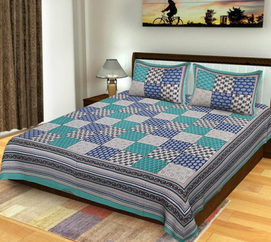 Turquoise Cotton King Size Standard Multi Pattern Rajasthani Bed Sheet With Pillow Covers - JBB17