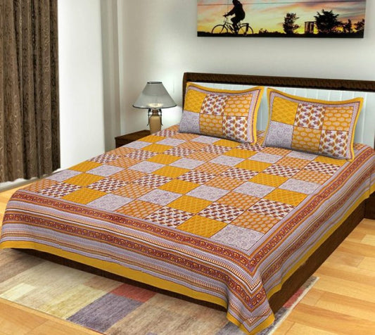 Yellow King Size Standard Cotton Sanganeri Bedsheet With Pillow Covers For Double Bed - JBB39