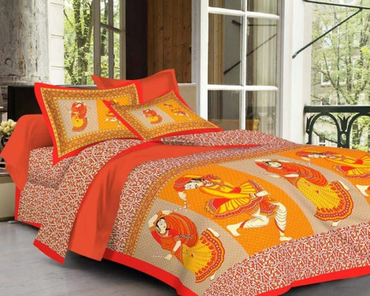 Sanganeri Orange Dhola Maru Print Cotton Double Bedsheet With Pillow Covers - JBB02