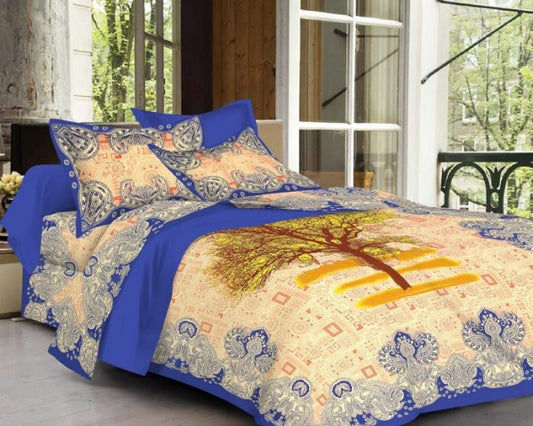Blue Tree Print Pure Cotton Double Bedsheet With Pillow Covers - JBB04