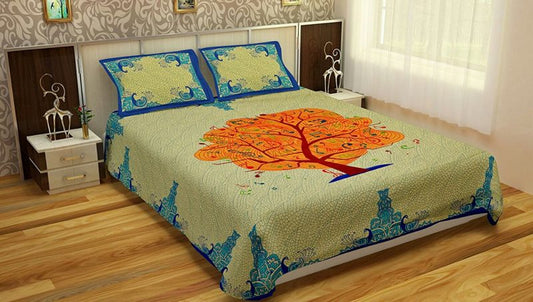 Green & Blue Tree Print Cotton Double Bedsheet With Pillow Covers - JBB05