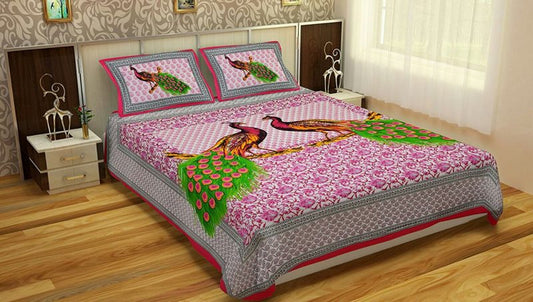 Pink Peacock Print Cotton Double Bedsheet With Pillow Covers - JBB10