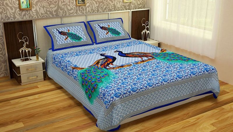 Buy Traditional print Cotton Blue Peacock Print Bedsheet with pillow covers. Sanganeri print bedsheets and Traditional prints are available at Jaipur Bazar. All kinds of double bed sheets are available at the best prices.