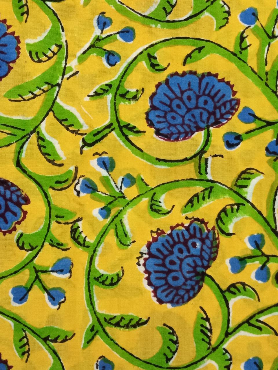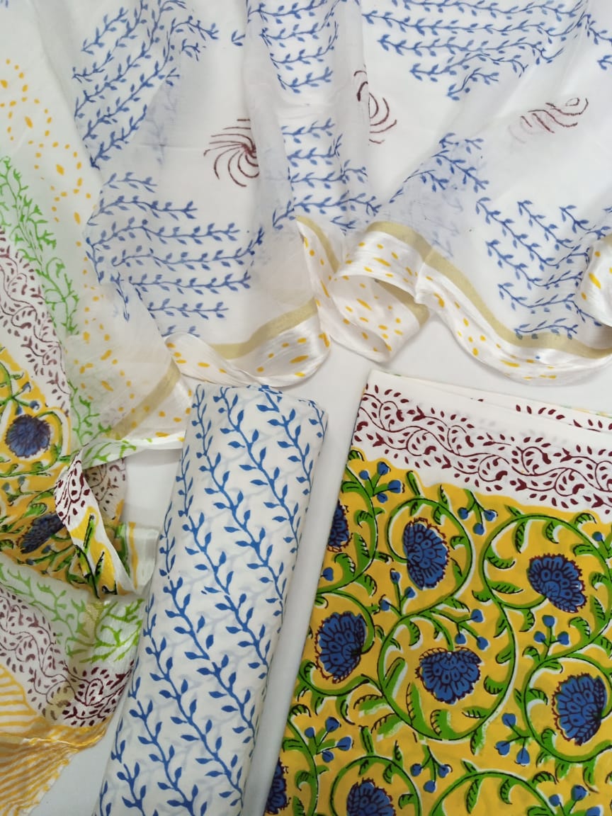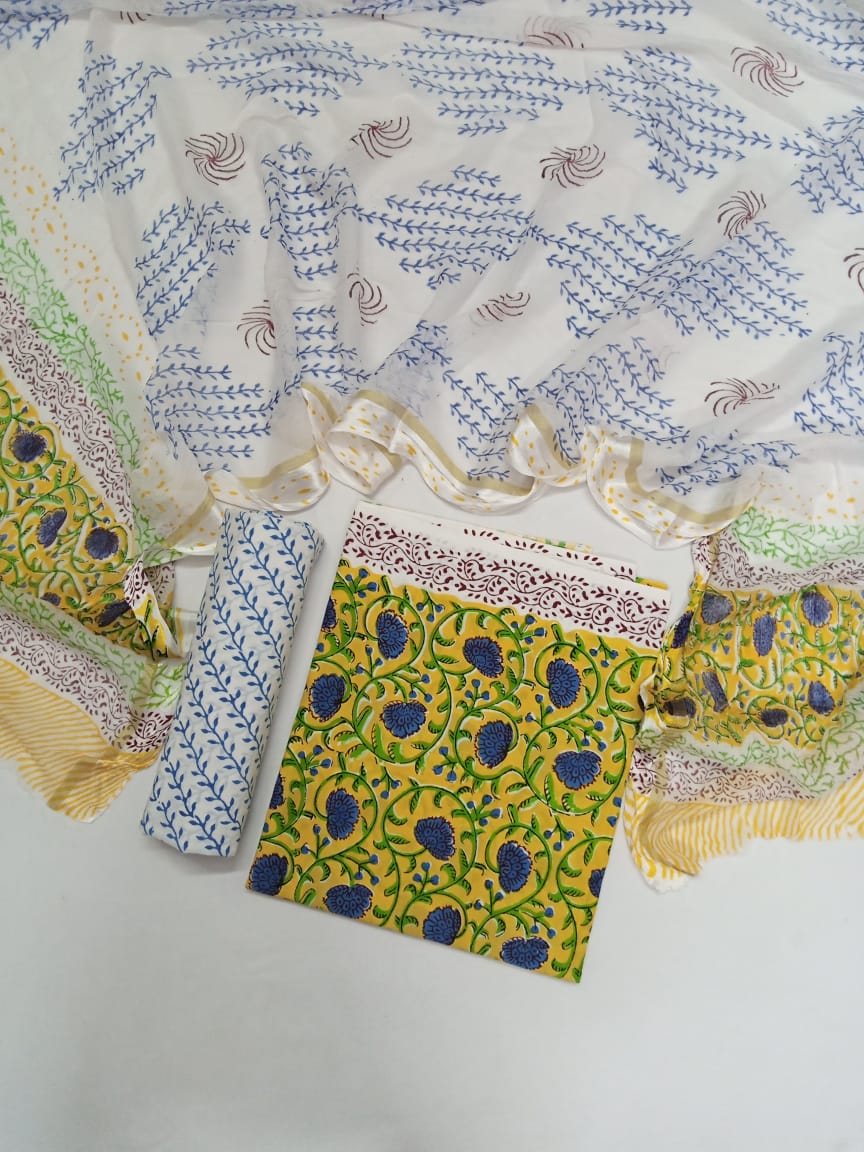 Yellow with Blue Florals Hand Block Printed Pure Cotton Unstitched Salwar Suit with Chiffon Dupatta - JB39