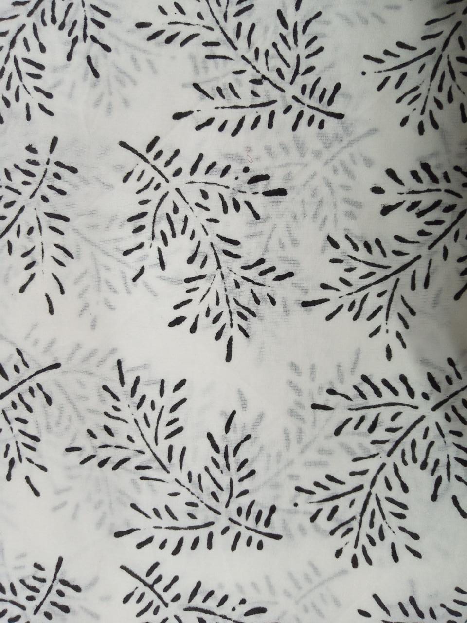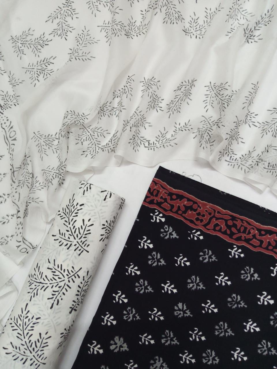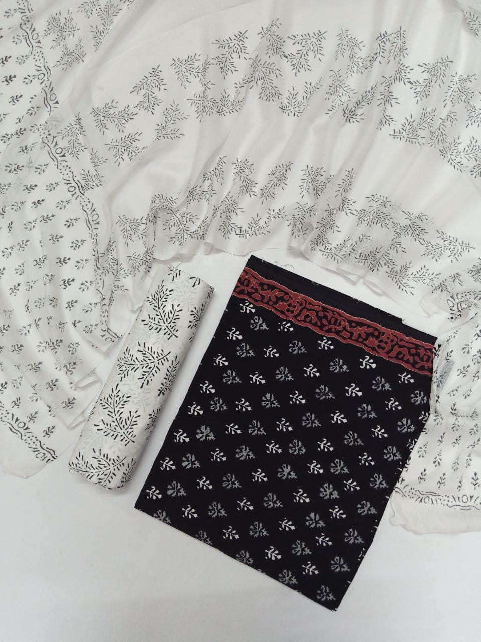 Black & White Small Buti Hand Block Printed Unstitched Pure Cotton Suit with Chiffon Dupatta - JB78