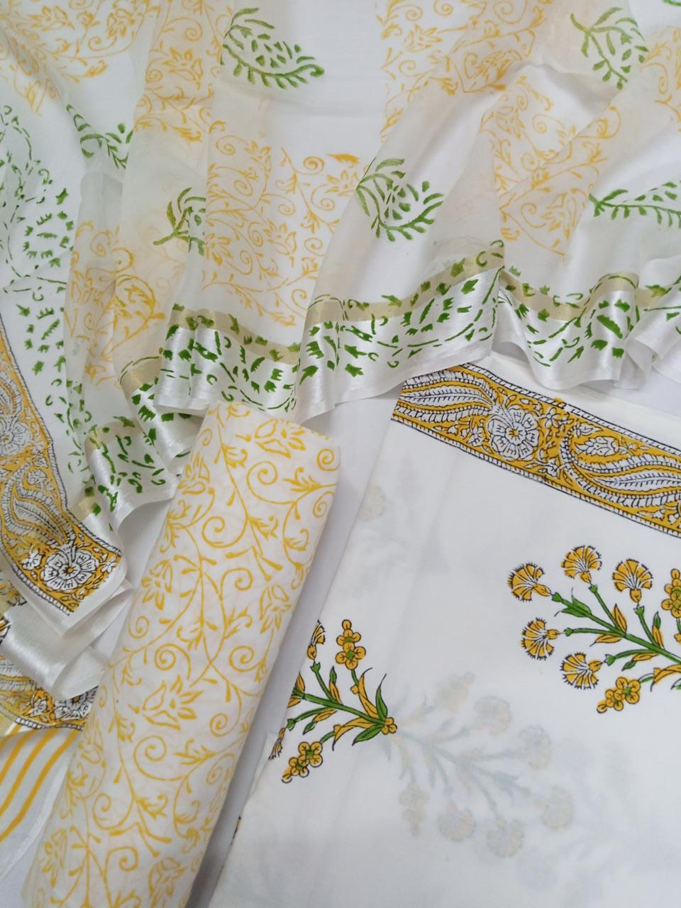White Base Kalamkari Buta Hand Block Printed Pure Cotton Unstitched Suit with Chiffon Dupatta - JB74