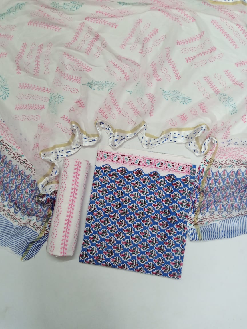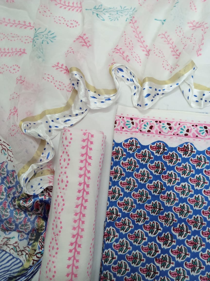 Blue with Pink & Sea Green Small Kalamkari Buti Hand Block Printed Pure Cotton Unstitched Salwar Suit with Chiffon Dupatta - JB38