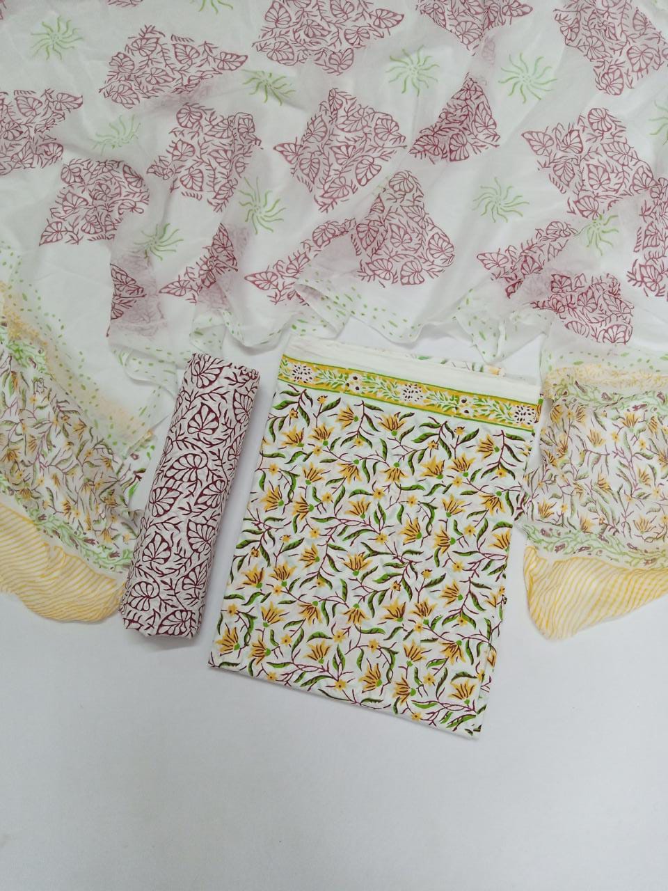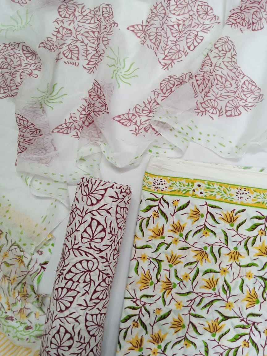White Base Yellow & Green Floral Hand Block Printed Pure Cotton Unstitched Salwar Suit with Chiffon Dupatta - JB25
