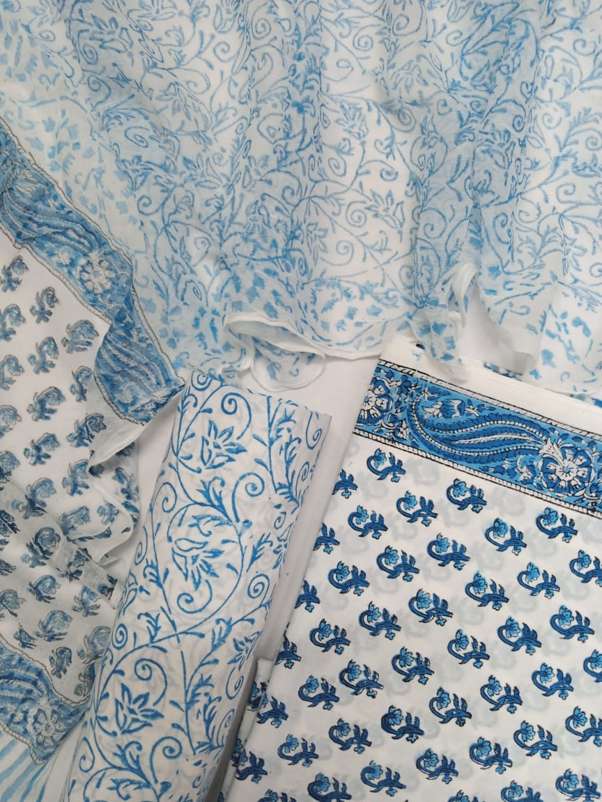 White Base Turquoise and Blue Buti Hand Block Printed Pure Cotton Unstitched Suit with Chiffon Dupatta - JB82