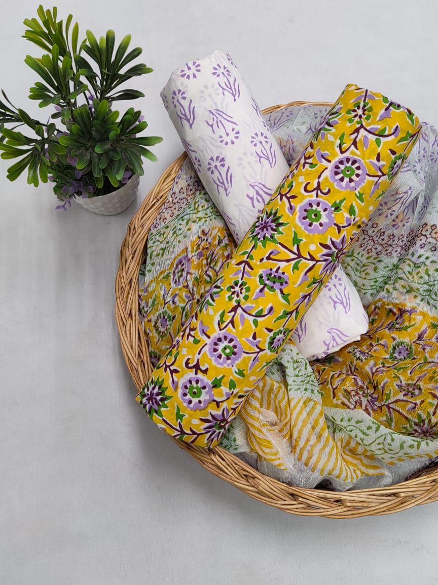 Hand Block Suit Set with Chiffon Dupatta - JBSSCFL1-101