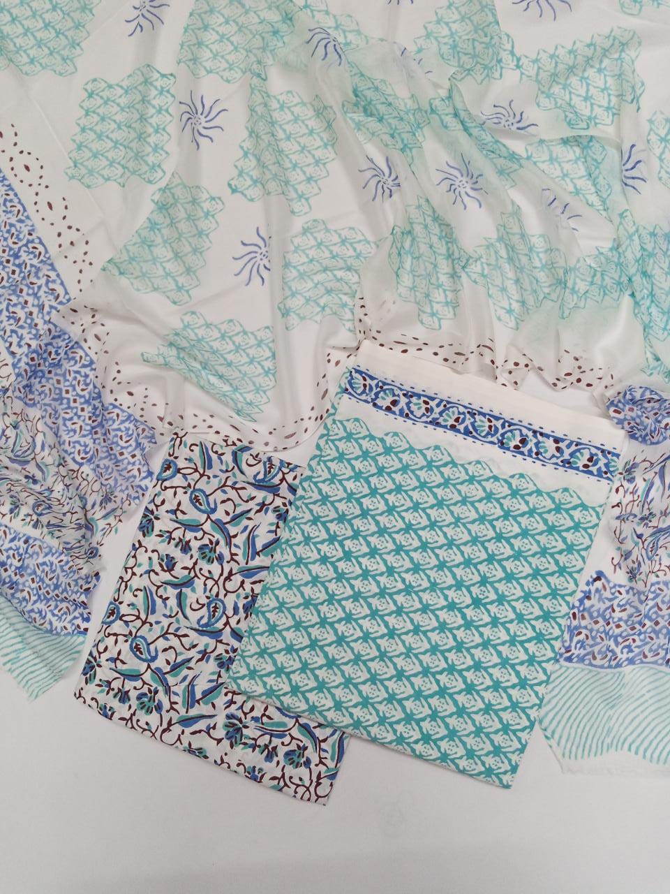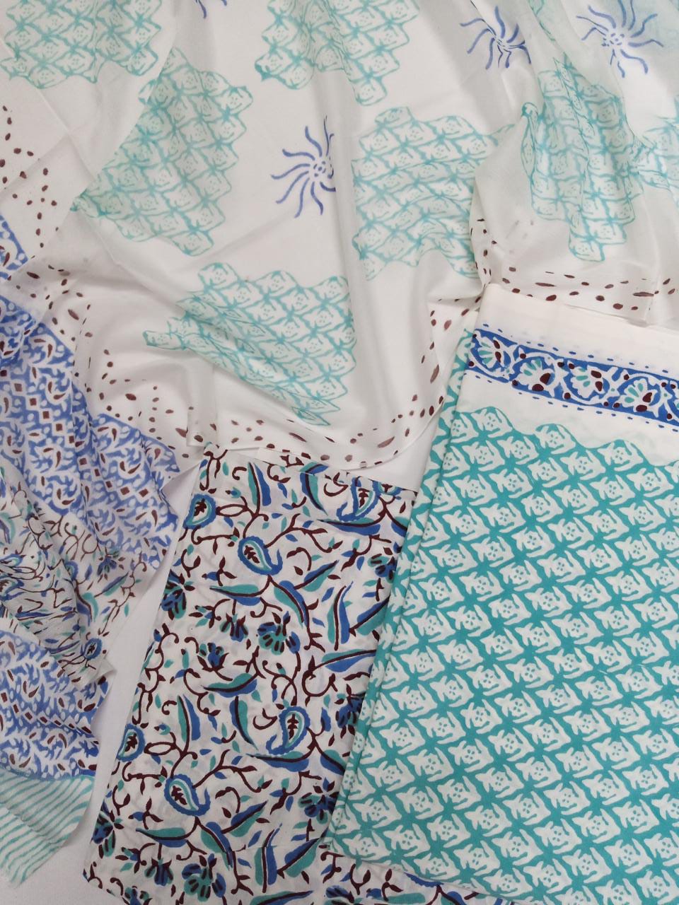 Sea Green with White Base Kalamkari Jaal Hand Block Printed Pure Cotton Unstitched Salwar Suit with Chiffon Dupatta - JB31