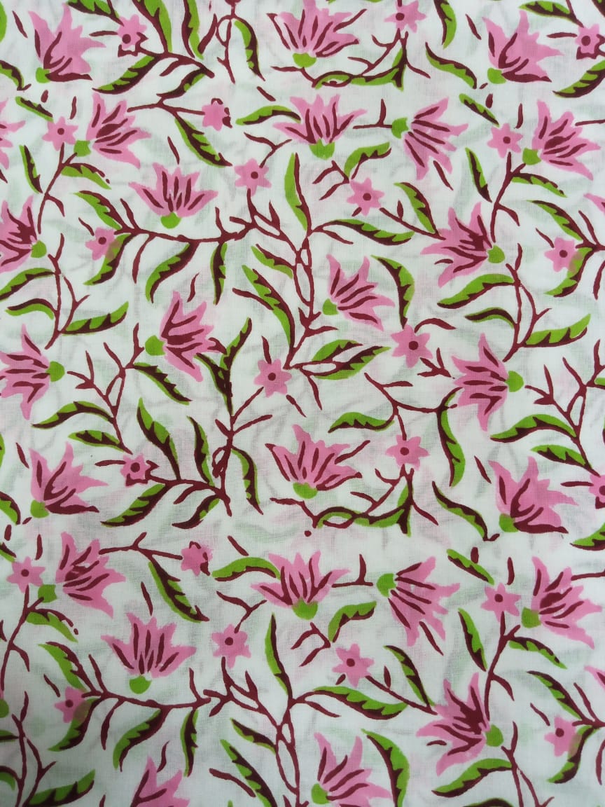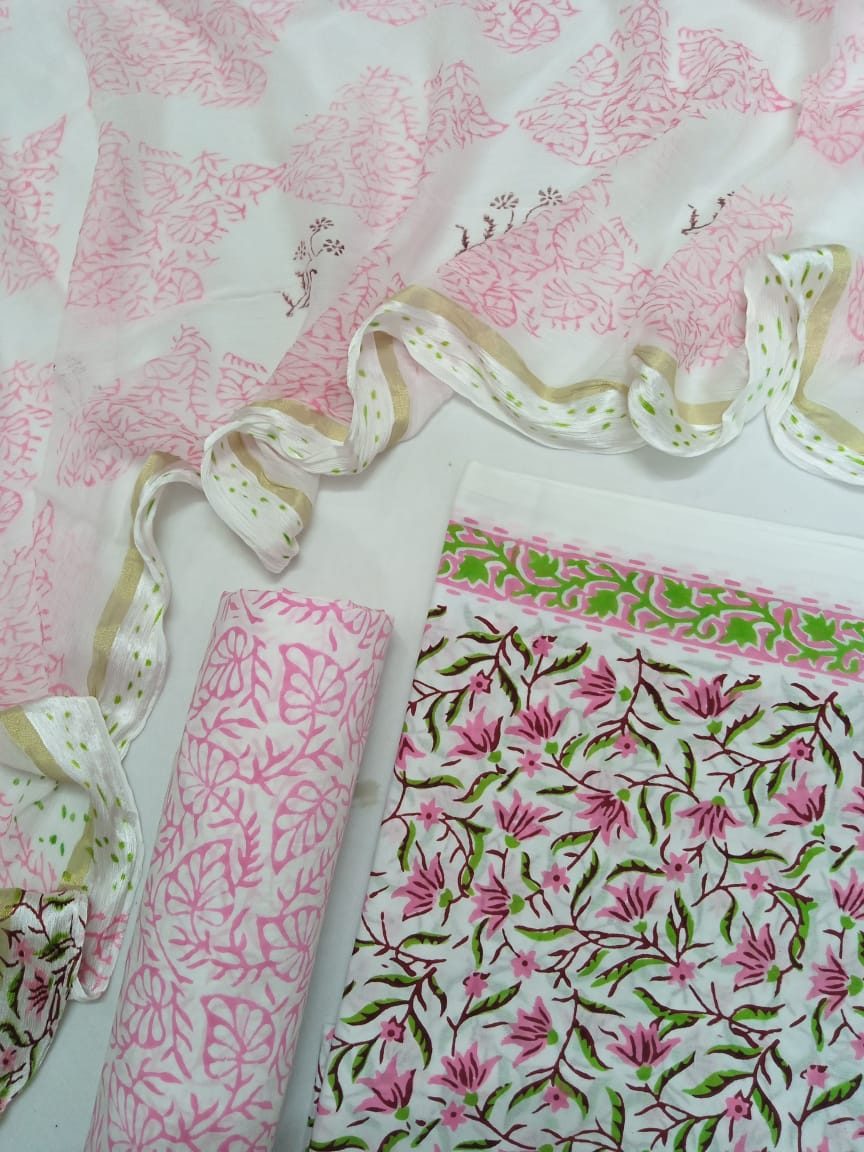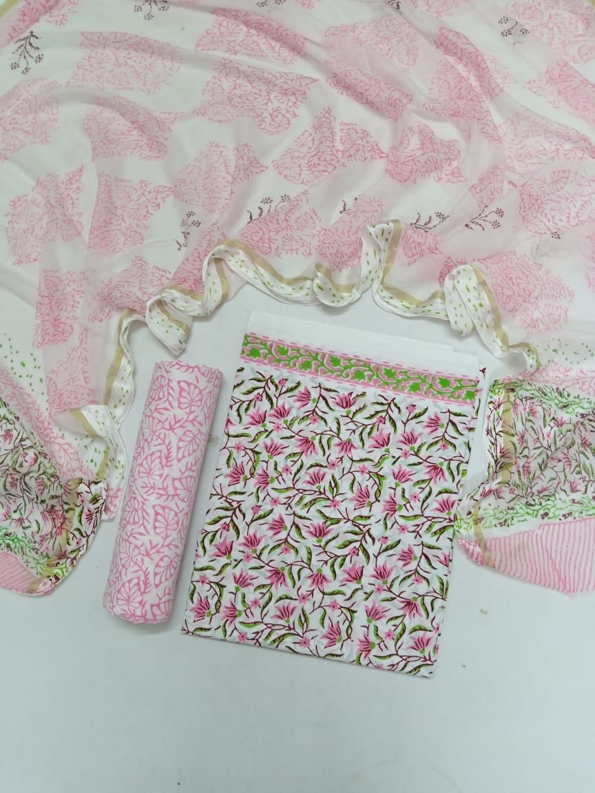 Pink & Green Floral White Base Hand Block Printed Pure Cotton Unstitched Salwar Suit with Chiffon Dupatta - JB11