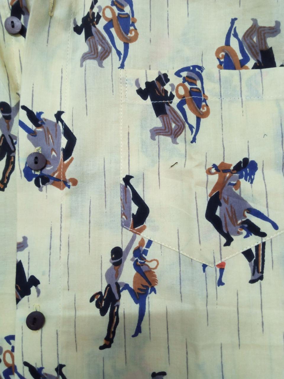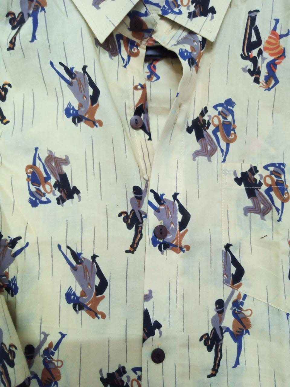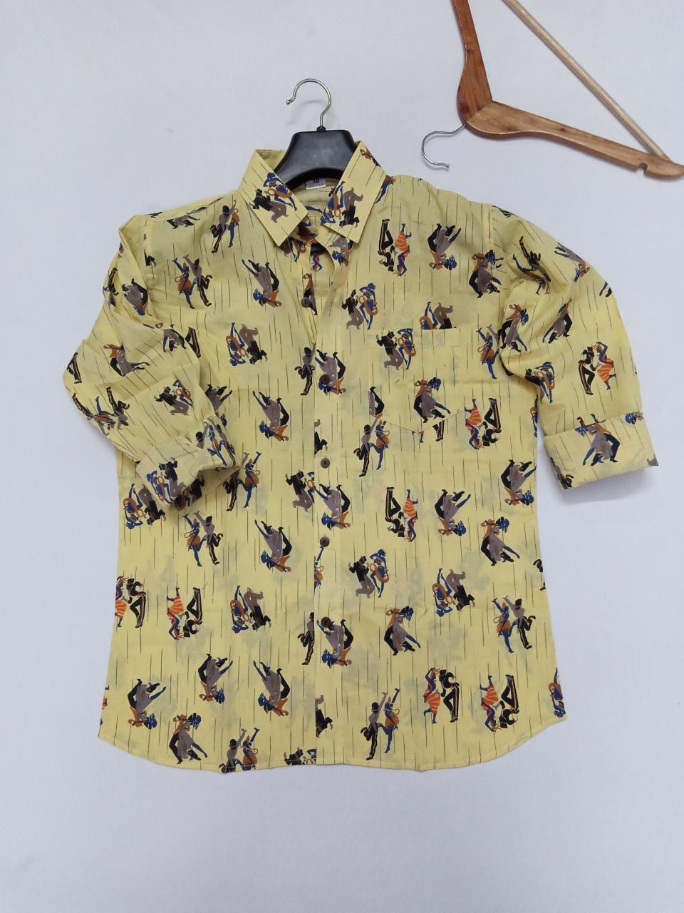 Light Yellow Dancing Couple Print Pure Cotton Hand Block Printed Men's Full Sleeve Shirt - JBSH01