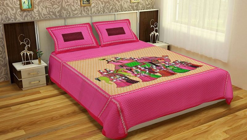 Buy Traditional print Cotton Pink Wedding Scene Print Cotton Double Bedsheet with pillow covers. Sanganeri print bedsheets and Traditional prints are available at Jaipur Bazar. All kinds of double bed sheets are available at the best prices.
