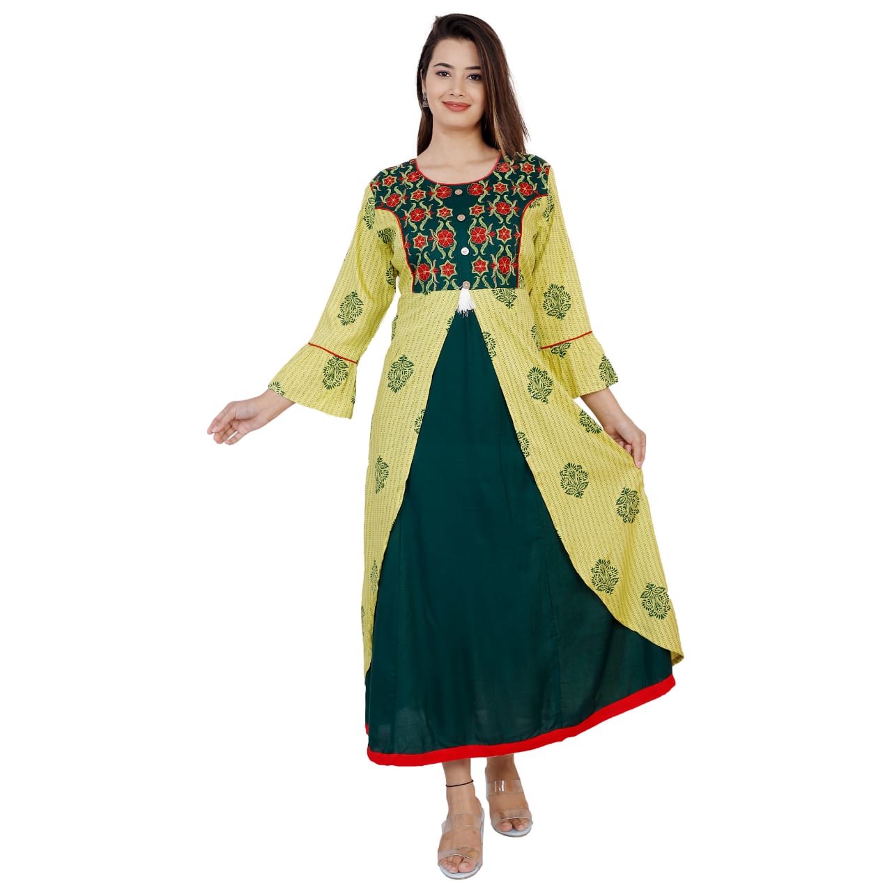 JaipurBazar Jaipuri Kurti Double Layer Printed Long Kurta Embroidery Work. Jaipuri Kurti Embroidery works Long Kurta for girls and women. It is printed up to 50% all over. Its printing makes it more appealing and fashionable. This kurta is made with the finest quality of Rayon slub fabric. This kurta can be wear on any occasion.