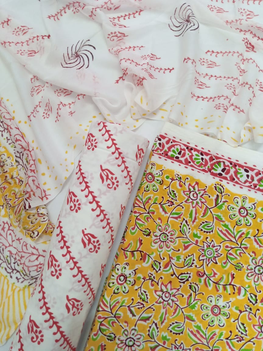 Yellow Florals Hand Block Printed Pure Cotton Unstitched Salwar Suit with Chiffon Dupatta - JB61