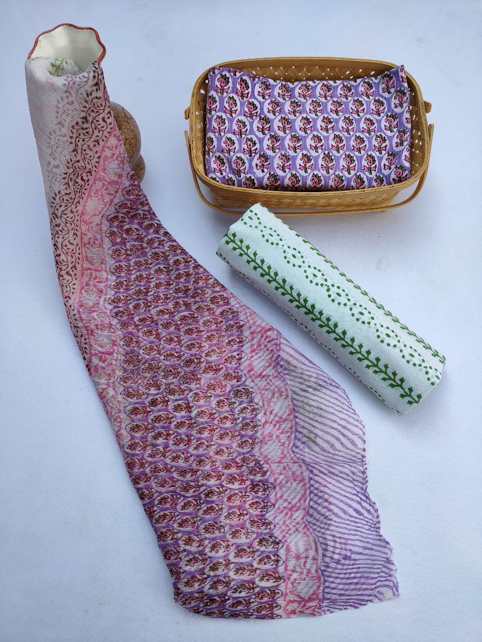 Unstitched Hand Block Printed Cotton Suit With Chiffon Dupatta - JBCF788