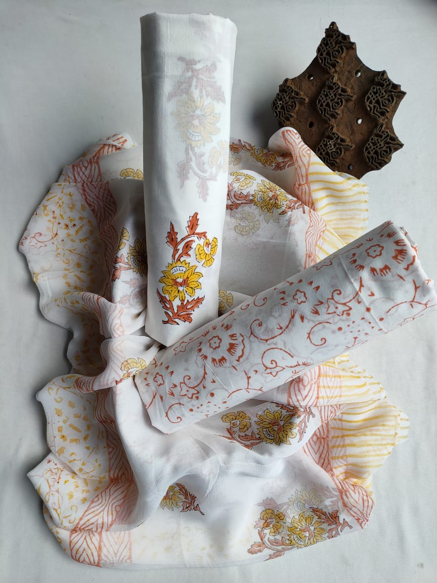 Unstitched Hand Block Printed Cotton Suit With Chiffon Dupatta - JBCF829