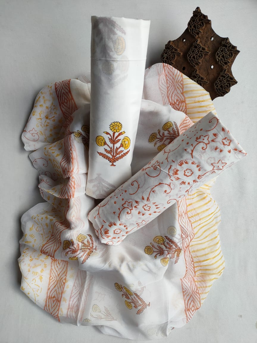 Unstitched Hand Block Printed Cotton Suit With Chiffon Dupatta - JBCF832