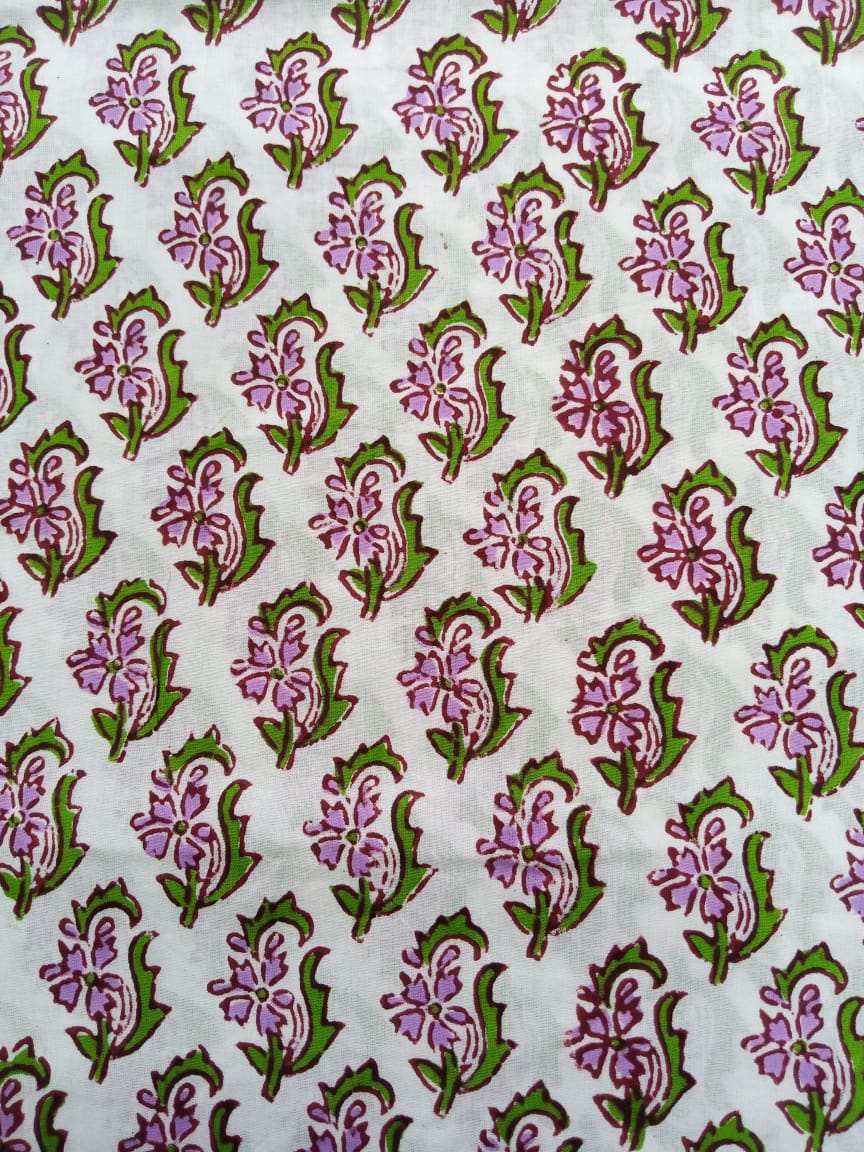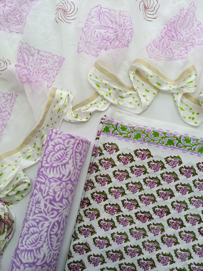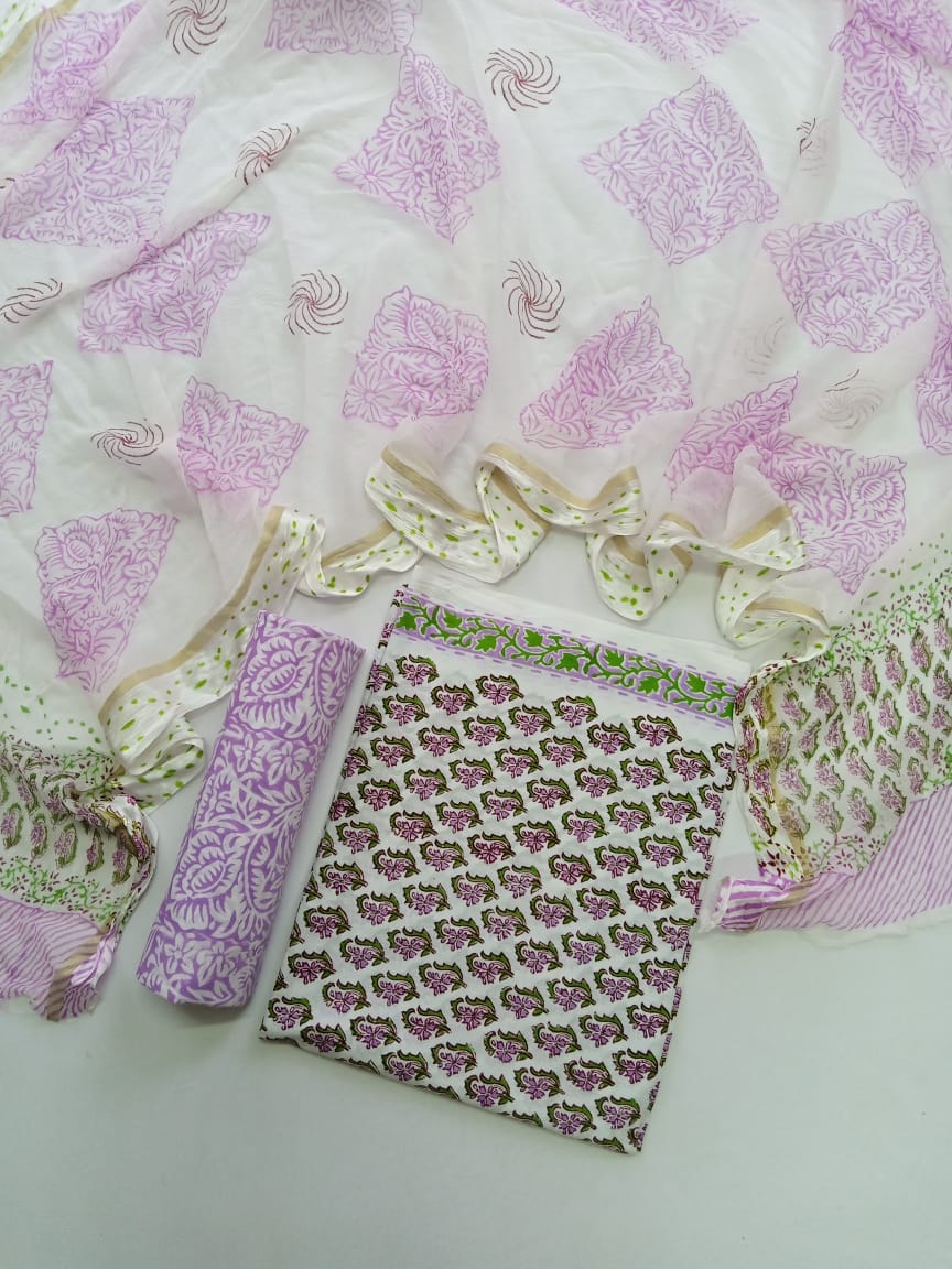 White Base Purple & Green Buti Hand Block Printed Unstitched Cotton Suit with Chiffon Dupatta - JB93